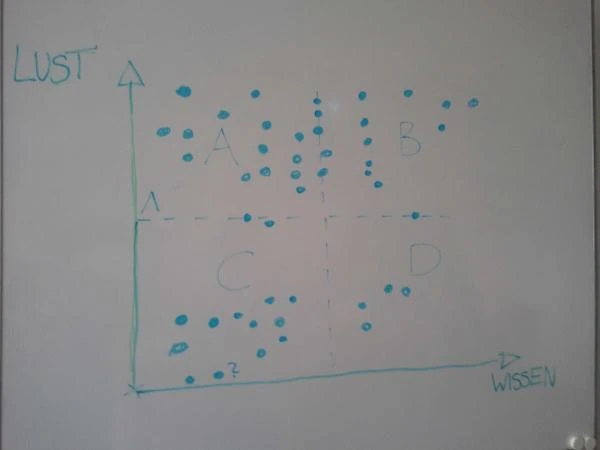 - Kurzvorstellung aller Teilnehmer mit Hilfe von je 3 Tags↑ und Zuordnung in einem Diagramm mit den Achsen x=Wissen, y=Lust und 4 Quadranten A-D (C-D mit ansteigendem Wissen, darüber A-B)